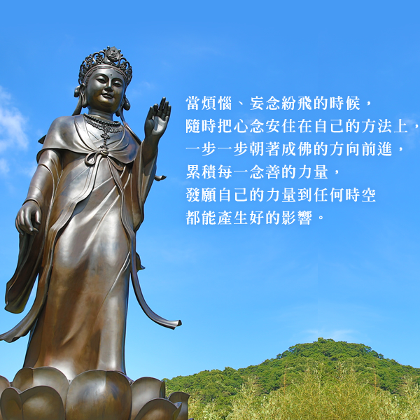 | 文 / 素超人整理 法鼓山的建設過程中和觀世音菩薩有諸多殊勝的法緣,因此法鼓山亦以觀世音菩薩精神為依歸,用「千手護持,千眼照見」的慈悲與智慧來關懷眾生。在法鼓山,觀音菩薩處處都在,時時都在提醒人們莫忘修學觀音法門:「處處觀音菩薩,聲聲阿彌陀佛」。 曾經有位執事非常忙碌的法師,百忙中撥空來到禪學班的結業典禮中分享自己如何在有限的時間內完成這麼多的工作。法師以 《觀世音菩薩普門品》中的句子跟大家分享: 「我為汝略說:聞名及見身,心念不空過,能滅諸有苦。」 並進一步說明:「若能心心念念都在法上,就能不起煩惱安住身心,即是能攝護六根,不造作生死之業,方能行自利利他的菩提之道!」當忙碌無法負荷時,身心疲累起煩惱時,這句話都給了我很大的幫助。提醒自己「快快提起佛號,放下煩惱」。 果然是大師曾經分享過一則關於觀世音菩薩的傳說: 無量劫前,觀世音菩薩曾立下大誓願:「我將盡我的形壽,遍度一切眾生,眾生未度盡,我誓不證正覺。」如此還不足以證明自己的決心,祂更進一步以自己的生命發下重誓:「若我自棄此誓願,就讓我的頭裂成千片!」 如此經過無數劫,雖然菩薩所度脫的眾生已經多於恆河沙,然而,環顧這世間的眾生,還是有無量無邊的人在造種種惡,觀世音菩薩於是尋思:「眾生之所以如此執迷,乃是眾生與生俱來的,只要這世間一日不滅,眾生的苦就沒有止盡,這樣一來,眾生是無法度盡的……」想著想著,觀世音菩薩如此結論道:「既然眾生度不盡,那我何必堅持如此無益的救度?曾經發的那個誓願,不過是徒勞──」這個心念才生起,菩薩的頭顱頓時碎裂! 這時,阿彌陀佛的身影即時現身,慈悲的聲音傳來,說道:「善哉觀世音,你的善願這麼好,千萬不要放棄,只要你繼續精勤度眾不退轉,三世十方的一切諸佛菩薩,都會加護你,助你度盡眾生,你的誓願終有達成的一日!」 阿彌陀佛的話令觀世音菩薩頓時生起大信心,在阿彌陀佛慈悲的法力及真言加護之下,碎裂的頭顱復還為一,從此,觀世音菩薩頭上便頂戴著阿彌陀佛的聖像,牢記著阿彌陀佛的教誨,精勤不懈地度著眾生,直至如今…… 這個傳說很讓人感動。因為,原來連觀世音菩薩也曾有起退心的時候;原來,諸佛菩薩真的不違本誓、不捨眾生,因此,不會忍見觀世音菩薩就此粉身碎骨;原來,在我們看不見的地方,諸佛菩薩都在慈悲加護著我們。 有人問聖嚴師父:「師父是否也有起退心的時候?」師父的回答是:「當然有!但是,我知道如何用方法及觀念來調整我自己、幫助我自己」。聖嚴師父最常用的方法是發願──「發願以後,只管盡心盡力,目標不改,當做錯或做不到的時候,不要氣餒,應繼續發願,繼續再做……好像嬰兒走路,都是從跌跌撞撞的經驗中成長的。」 因此,請不要輕易對自己失望,只管發願繼續前行;不要輕易對他人失望,每個凡夫都只是嬰兒行的菩薩;也不要輕易對外界、對社會失望,從因緣法來看,所有的現象都是過程,只要人人能以自己的一念善心澆灌,人間是永遠有希望的。 不管何時,失望了、灰心了,只要想一想,我們不孤單,諸佛菩薩都在我們身後支持著我們呢! |