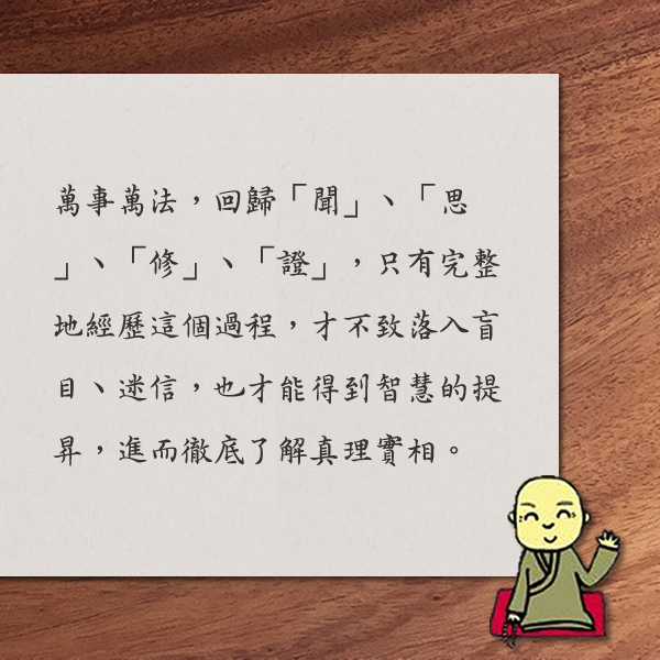 萬事萬法,聞而思,思而修,修而證,便能避免我們的心隨外境起伏 取得連結 Facebook X Pinterest 以電子郵件傳送 其他應用程式 9月 23, 2020 心靈電子報第877期 2020-9-23 心靈電子報/每週三發報 果然是大師 該相信什麼? 思惟、核對、查證,便能避免我們的心像羽毛一樣,隨著一陣陣資訊風、事件風而起伏。 ■ 文╱果然是大師 自古至今,對於真理與實相,不同立場、不同領域、不同學派,往往有不同的見解和立論,而若是每個人都宣稱自己所知所見是唯一正確的,那麼,我們應該相信誰? 在佛陀的時代,噶拉瑪村由於位處交通要道,聚集了許多南來北往的商旅及修行者,因而各種新知、學說激盪爭執不休,佛陀在遊化至此時,面對眾人「該相信誰?」的疑問,他如此回應道:「不可因為口口相傳就輕易信以為真;不可因為傳統如此就輕易信以為真;不可因為流傳久遠或是轟動一時就輕易信以為真;不可因為引經據典就信以為真;不可因為合乎邏輯就信以為真;不可因為根據哲理就信以為真;不可因為符合先入為主的觀念就信以為真;不可因為權威所說而信以為真;不可因為是沙門、導師所說,就信以為真。」 眾口能鑠金,三人能成虎,對於口耳相傳的事情或說法不能輕信,這是一般人都知道的道理,因為傳播過程會經過多手有意無意的揀擇、錯漏,以至漸漸偏離真實。然而,佛陀更表示,對於親眼所見的經典記載,甚至親耳聽聞佛陀、佛陀的弟子所說的,也不能夠輕易相信,這是為什麼? 在《四十二章經》中,佛陀說的另一段話可做為解釋:「慎無信汝意,意終不可信……得阿羅漢道,乃可信汝意耳。」因為凡夫還有見思二惑,還有我愛、我見,而存在自我立場的偏狹,因此,僅從自己的角度來聽、來看,而對於實相不能盡知盡見。 既然別人說的可能有問題,書上記載的可能有問題,自己的所思所見也可能有問題,那麼,佛陀是要我們乾脆不聽、不看、不想嗎?其實,佛陀是要所有的佛弟子們,對於萬事萬法,回歸「聞」、「思」、「修」、「證」,只有完整地經歷這個過程,才不致落入盲目、迷信,也才能得到智慧的提昇,進而徹底了解真理實相,不僅面對修行是如此,面對世間事亦然。 在這個眾聲喧嘩,而訊息也以秒數更新的時代,我們曝露的資訊流何止千萬倍於佛陀時代的噶拉瑪村,一個接一個的事件與言論爭取著我們的注目,甚至是認同與附和,當我們莫衷一是時,不妨試著回歸佛陀的教法,聞而思,思而修,修而證,亦即,進行思惟、核對、查證,便能避免我們的心像羽毛一樣,隨著一陣陣資訊風、事件風而起伏了。 聖嚴法師法語 人很容易對自己的成就誇大, 對別人的貢獻卻不見得認同。 這是因為瞭解自己比瞭解他人更困難。 人的眼睛、耳朵都是向外看、向外聽, 很少有人會向內看、向內聽; 如同伸出手來,都是指著他人, 指東、指西,很少是指往自己的良心, 或是聆聽自我內心審查的聲音。 ◎ 摘自:《平安的人間》 本 週 選 讀 聖嚴法師中華禪法鼓宗禪法研究 釋果暉 法師於著作之撰寫,雖運用了學術方法,但其最終悲願是:要將他所體驗到的佛法、禪法毫不保留地與世人分享...... 忙人的電鍋素燉補:零失敗、免廚藝、提升免疫力的養生湯品天天做 江豔鳳 萬能的電鍋不僅能煮飯,製作起燉補料理更是簡單又方便最適合大忙人、大懶人,以及零廚藝、無基礎的廚房新手...... 智慧掌中書 「忍」所指的是忍辱、忍耐,也是接受、承認、認同的意思。 唯有心甘情願接受苦難的折磨,才是最大的忍耐,如果不能接受,那就不是忍辱了。 例如說,在打坐時,很多初學者不習慣,坐了一段時間就腿痛、背痛,甚至頭都痛起來;然而,如果接受它、面對它,就不會感到很苦。 我在修行時就是如此體驗,痛得厲害時就告訴自己:「原來這就是痛,看看它能痛到什麼程度?」 我不是忍,而是不拒絕它,也不去克服它,隨它去痛。 同樣地,面對打擊時,能不起瞋怨心,便是在修行忍辱波羅蜜。 我一生中經常遇到極不如意的棘手事,我和弟子們便以信心和耐心,忍辱負重,共度難關。 麻煩事發生時,絕不可怨天尤人,起瞋恨心,否則將導致走投無路。所以,我常把不如意事,當作教導我成長的恩遇來感謝。 摘自:《忍耐不忍氣》 延伸閱讀: 跟一行禪師過日常(5冊合售) 一行禪師 忙碌的現代人往往忘記日常生活中行、住、坐、臥是什麼滋味。本系列用不囉唆卻發人深省的簡短段落,讓人在紛擾的世界中,隨時隨地,念念清明。全套5冊,完整收集,體會一行禪師的日常禪法…… 活 動 頭 條 迎接逆光勇敢向陽 法鼓山人基會頒關懷生命獎 「2020年法鼓山關懷生命獎暨論壇」於9/20下午1點30分,在臺北中油大樓國光廳舉行,近千位民眾親臨現場觀禮,本屆還有許多民眾是透過法鼓山網路電視台直播參與,共同為得獎者感恩與祝福...... 做快樂的成功者 法鼓山領青年禪式充電 法鼓山世界青年會於9/18~9/20在北投雲來別苑舉辦「社青禪修營」,帶領67位青年進行週末的心靈充電,除了體驗法師帶領早晚課、基礎禪坐與八式動禪,並觀看法鼓山創辦人 聖嚴法師的開示影片,練習透過修行方法與轉念,享受在都市鮮有的簡單與寧靜...... 【莊嚴心地隨身佛堂組】新品上市! 透過禮拜諸佛菩薩,禮拜自身的佛性,提醒自己精進,學習諸佛菩薩的精神。 查看活動 法鼓文化 版權所有 © 2020 Dharma Drum Corp. All Rights Reserved 電子報管理:點此訂閱 / 取消電子報 取得連結 Facebook X Pinterest 以電子