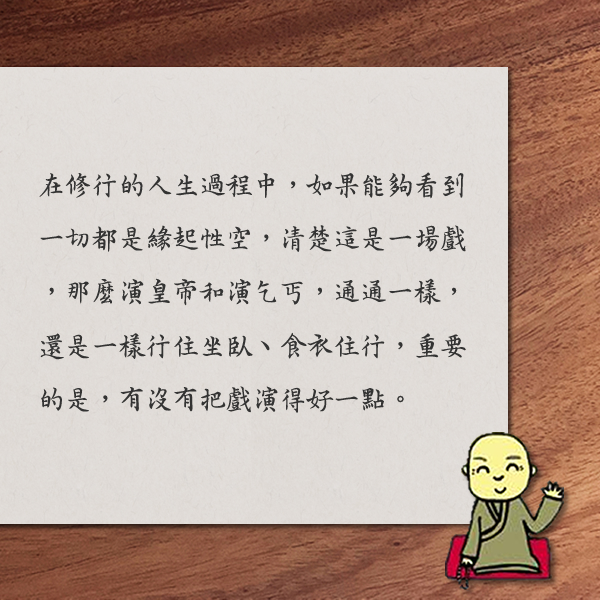 人生如戲似夢,我們就恰如其分地好好演,做一場美好的夢 取得連結 Facebook X Pinterest 以電子郵件傳送 其他應用程式 9月 09, 2020 心靈電子報第875期 2020-9-9 心靈電子報/每週三發報 果然是大師 皇帝和乞丐,演那個好? 不必沉溺其中、不用執著什麼,演完了,就放下。 ■ 文╱果然是大師 日前,出席一位資深義工菩薩的告別式,會場上,沒有生平介紹,只播放了一段他在福田班課堂上的分享,短短兩分鐘的影片,風趣又智慧地說出了他對生命和生死的態度,讓人印象十分深刻。 《金剛經》有個著名的偈子:「一切有為法,如夢幻泡影,如露亦如電,應作如是觀。」他說,在修行的人生過程中,如果能夠「看到一切都是緣起性空,清楚這是一場戲,那麼演皇帝和演乞丐,通通一樣」,做皇帝沒有比較偉大,做乞丐也沒有比較辛苦,演戲的時候,還是一樣行住坐臥、食衣住行,重要的是,有沒有把戲演得好一點。 我們每個人的一生中,為人子女、父母、夫妻、部屬、主管……總是有很多種身分,一般人將這些當成責任,扛在肩上,難免沉重了些;那位義工菩薩說是演戲,把身分當成角色來扮演,聽起來可輕鬆多了。既然知道在演戲,還可以提醒自己:不必沉溺其中、不用執著什麼,演完了,就放下。 與那位義工菩薩相識好幾十年了,台上分享佛法的他,幽默、風趣、自在;平常不說話的時候,他的表情其實滿嚴肅的。記得有次問他:「為何這麼嚴肅?」他說,自己以前扮演警官,要訓練新生射擊,深怕一有輕忽而擦槍走火,所以必須演得嚴肅;來到福田班、讀書會,他扮演的是快樂學佛人。 這兩年多來,他扮演著病人的角色,效法聖嚴師父「不怕死、不等死、不找死」,自在面對,接受病痛。現在的他,卸下了這一場的戲服,換成別的角色,繼續去演下齣戲了。 師父曾寫了一幅書法:「戲外看戲忘了戲,夢中做夢不知夢。」人生是一場戲,也是一場夢,既要好好入戲,也得明白自己在演戲,就像那位義工菩薩所說:「當你面對那一關,你知道是什麼的時候,就會離苦得樂。」 所以,知道是戲,清楚是夢,我們就恰如其分地好好演,好好地在夢中,做一場美好的夢。 聖嚴法師法語 凡夫的言語行動, 如果加以深切仔細考察, 可以說經常都在犯罪造業。 凡夫的生死輪迴, 即是由於各自所造的「業力」所牽引, 如在過去世中不曾造下罪業, 現在便不會再做凡夫, 如果今生斷除了一切罪業, 當下就是聖人的境界。 ◎ 摘自:《學佛知津》 本 週 選 讀 聖嚴法師中華禪法鼓宗禪法研究 釋果暉 用基本的禪修方法,可以體會到稍為安定的我時,從而認識到禪修前的我是多麼散亂、多麼不安定...... 揭開身心的奧秘:阿毗達摩怎麼說? 善戒禪師 因為困惑而找尋修行道路的人啊!阿毗達摩是佛陀揭示的一條清晰道路,導向世間和出世間的安樂...... 素食聰明吃 禪味小食堂──椒麻皇帝豆 皇帝豆的學名是萊豆,又稱白扁豆,因豆粒大、富含蛋白質、脂肪、鐵質、纖維質,營養價值高,居豆類之冠,因此俗稱「皇帝豆」,產期從11月到翌年5月。皇帝豆無論煎煮炒炸或涼拌,各有不同風味,所以常常入菜。又因為豆粒大,為了快速入味,採類醬燒做法,加上用花椒粒調味,微麻的口感與香氣讓人胃口大開。 做法 : (1)皇帝豆洗淨,放入滾水汆燙,撈出、瀝乾。 (2)起熱鍋,倒入1大匙的油,用小火爆香老薑、花椒粒,加入所有調味料和皇帝豆,煮至皇帝豆熟軟,水分收乾即可。 摘自:《人生雜誌388期》 延伸閱讀: 按一鍵就OK!電鍋素超簡單:煎煮炒炸、燜蒸燉烤,從主食到小菜,一鍋搞定 江豔鳳 好吃的料理值得等待,用電鍋慢燉或是花多點時間準備、烹調,才能成就完美的味道,讓我們用心做、認真吃,品味出食材的真滋味...... 活 動 頭 條 以信願行解眾生苦 求度行者感恩親友成就出家宏願 法鼓山僧伽大學於9/5下午1點半在國際宴會廳,特別為求請剃度的行者及其家眷親友們安排與方丈和尚會面,9位求度行者在茶敘交流中,向俗家親友述說學習心得;而行者家親真情流露出的不捨與祝福,歡笑與淚水相互交織,讓現場充滿溫馨的感動氛圍...... 普施法食入覺海 紫雲寺中元三時繫念度己度眾 將慈悲心化作壇場,禮請諸佛菩薩受供、僧團法師說法,接引受苦眾生往生極樂。法鼓山紫雲寺於9/6上午9點舉辦「中元三時繫念法會」,有上千人次前往寺院或在網路同步共修...... 《禪的智慧》大字版上市特惠中! 聖嚴法師與西方禪修者的對話集,緊扣現代人與佛法相關議題 查看活動 法鼓文化 版權所有 © 2020 Dharma Drum Corp. All Rights Reserved 電子報管理:點此訂閱 / 取消電子報 取得連結 Facebook X Pinterest 以電子郵件傳送 其他應用程式 留言