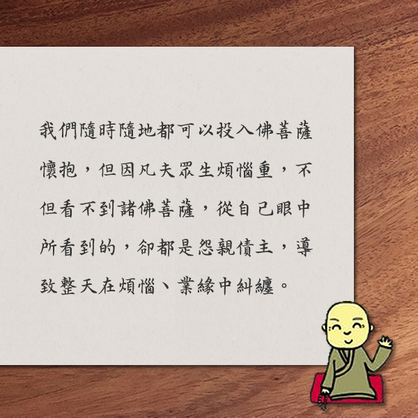「看護」更是學觀音、做觀音,並享受助人為善的樂趣 取得連結 Facebook X Pinterest 以電子郵件傳送 其他應用程式 10月 21, 2020 心靈電子報第881期 2020-10-21 心靈電子報/每週三發報 果然是大師 看護是誰?誰是看護? 觀音菩薩的慈悲願力,即是「看」照、守「護」著眾生。 ■ 文╱果然是大師 近日,出席一場佛化聯合祝壽,看到一百多位老菩薩,身上別著胸花,一桌一桌坐著開心地談話,我也前往一桌桌的關懷和祝福。在席間,看到許多年輕的臉孔,就近問一位男眾年輕居士:「有別胸花者是壽星,沒有別花是甚麼人呢?」 「看……護!」聽起來有點無奈,也有點玩笑的回應。才剛說完,就聽到主持人宣布活動開始。趕緊回到座位,「誰是看護?看護是誰?」讓人陷入思考。 近年,「看護」已與生病、臥病、無奈、沒有希望等印象連在一起。但想,佛法怎麼看看護?其實,當聽到「看護」這兩個字時,第一個想到的卻是觀音菩薩。觀音菩薩的慈悲願力,即是「看」照、守「護」著眾生。所以,真正最資深的看護是觀音菩薩。 聖嚴師父也曾開示、勉勵我們:三世諸佛、菩薩都在我們身邊,我們隨時隨地都可以投入佛菩薩懷抱,但因凡夫眾生煩惱重,不但看不到諸佛菩薩,從自己眼中所看到的,卻都是怨親債主,導致整天在煩惱、業緣中糾纏。 搜尋聖嚴師父的《法鼓全集》電子版,輸入「看護」一詞,則意外看到一則佛陀時代的故事。在釋迦世尊時代,就有對於病患的看護以及臨終的關懷。在《增一阿含經》中,佛陀告訴比丘們:「其有瞻視病者,則為瞻視我已;有看病者,則為看我已;所以然者,我今躬欲看視疾病。」 意思是說,比丘們當為生病的比丘作看護,就等於為佛陀作看護。照顧了病人,就如同照顧了佛陀,而佛陀自己也要親身看顧病人,甚至佛陀親自替病比丘洗衣的記載。 這看來實在很不可思議,但卻讓我們提起一股正向力量,就如佛教的八福田中,看病福田是第一福田。這「看護」不但是第一福田,更是在學觀音、做觀音。 聖嚴法師法語 唯有能自知才算真的有自信心, 才會對自己當前的生命, 乃至對生命的未來, 充滿光明的遠景和信心, 而真正做到對自我負責。 這也是對自我的溝通和自我的協調, 這個層次,稱之為修心。 ◎ 摘自:《聖嚴法師與人文對話》 本 週 選 讀 禪的智慧─與聖嚴法師心靈對話(大字版) 聖嚴法師 我希望這些對話能幫著回答讀者的一些問題。我確信他們會提出更多的問題,而且有些人會不同意我的回答。那也很好。佛教要維持活力,就必須接受檢驗...... 心念自癒力:突破中醫、西醫的心療法 許瑞云, 鄭先安 心念的浮動牽動全身的神經網路;心念與情緒愈平和,神經網路的協調聯繫就愈穩定,內分泌系統的調節功能及免疫系統的防衛與修復能力,也就跟著愈強大...... 智慧掌中書 追求快樂沒有什麼不好,因為它是促使人成長的動力。 矛盾的是,當你千辛萬苦追求到手後,卻可能發現追求到的並不是真正的快樂。 一般人都是心不由己,沒有辦法掌控自己。處於這種情形下,自己也不知道究竟是樂還是苦?而這種不明苦樂的焦灼本身就是苦。 因此無聊時,需要找人聊天,或是找些娛樂來消遣自己,讓心有個寄託的地方,否則便不知道該把心放在哪裡。 針對這種情況,修習禪法能幫助我們集中心念,得到定樂。因為在定中的人,心無所寄,根本不需要再向外求取寄託,如果一定要說有所寄的話,也是寄於一念心上。 因為寄於一念心上,所以心能夠安定、安住下來,當內心世界變得穩定,就不會再被外境的風吹草動所動搖了。 摘自:《快樂自己決定》 延伸閱讀: 真正的快樂(大字版) 聖嚴法師 人可以永遠快樂,而不煩惱嗎?戀愛的人怕失戀、有錢的人怕沒錢、得意的人怕失意……,有沒有一種「真正的快樂」,可以讓我們的人生只有希望,沒有失望呢?…… 活 動 頭 條 心燈耀大願 護法返校重溫興學點滴 法鼓山護法總會與法鼓文理學院,於10/16~10/18邀請臺北城中分會、新北海山分會的護持信眾一同「返校」,在充實的課程互動中,重溫久違的校園生活;並藉由文理學院的專業師資群講座分享,感受文理學院推動大學院教育的堅強軟實力...... 三昧法水淨滌身心 農禪寺領眾拜《水懺》 法鼓山北投農禪寺於10/17上午9點,舉辦一年一度的「慈悲三昧水懺」法會,這也是防疫新生活後,首度開放民眾參與的大型法會,在莊嚴和諧的氛圍中,上千位民眾一雙雙專注歡喜的眼神,從懺文裡細讀悟達國師的警語,以慈悲清涼的法水洗滌罪垢,透過至誠反省、懺悔、禮拜、發願,為新的人生開展新氣象...... 【心田感恩慶】心田點數使用優惠至12/15! 【心田會員 專屬折扣】書籍影音全館78折,修行生活全館88折 查看活動 法鼓文化 版權所有 © 2020 Dharma Drum Corp. All Rights Reserved 電子報管理:點此訂閱 / 取消電子報 取得連結 Facebook X Pinterest 以電子郵件傳送 其他應用程式 留言