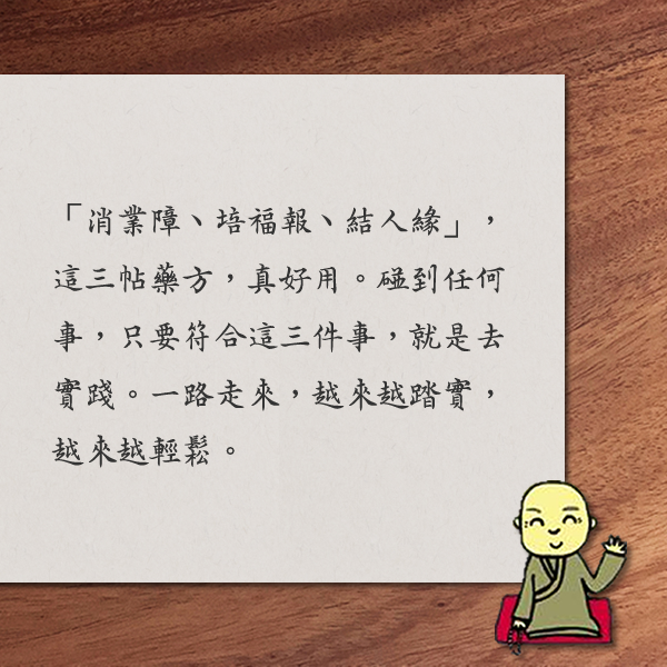 在修行道路上,感恩大眾的成就,珍惜相遇的緣分 取得連結 Facebook X Pinterest 以電子郵件傳送 其他應用程式 12月 02, 2020 心靈電子報第887期 2020-12-2 心靈電子報/每週三發報 果然是大師 有漏之福易漏失 修行的基礎,就是「消業障、培福報、結人緣」。 ■ 文╱果然是大師 「有漏之福易漏失,無漏之福難修得,稍有福時不惜福,福盡修福已嫌遲。」 這是出自1987年8月號的《人生》月刊,聖嚴師父勉勵農禪寺常住諸仁者的一封信,篇名為〈師父叮嚀語〉。 這篇33年前的叮嚀語,現在讀來,仍是非常深刻和有力量。 師父說:他在美國的道場初成之時,即以「平時餓不死,寒季凍不死」的最低生活標準,用來自我勉勵。而他每到一個地方,就是關照為衣食奔走掙扎的貧苦大眾。每晚課誦的蒙山施食之時,即想到前來受食的焰口餓鬼,曾經都是有福享福,而不知惜福培福的人。 日前,法鼓山上正在進行水陸法會。即跟與會信眾菩薩分享:我們要感恩在這國際疫情強襲之際,台灣環境因緣,讓法會可以如期舉行;更要感恩自己的善根、福德,有因緣可以上山參加,感恩心也是惜福。 而這善根、福德都是個人累世修得。如何修得,看到聖嚴師父所說:「有漏之福易漏失,無漏之福難修得」,即深有所感,處在現代物質充裕的時代,常有人會有:「我就是有福報啊,如果不用,也是可惜,不是嗎?」師父說,有這想法的人,是倒因為果之說。師父還勉勵,有福的人,自己要惜福,並把福報施於大眾,即是在做著培福、種福、造福的事。 學佛強調要「福慧雙修」,以前不明白修福的重要性,但越是走在修行道上,越能感受到,福報實是修行基礎。記得剛出家時,師父即勉勵我們:修行的基礎,就是「消業障、培福報、結人緣」。 「消業障、培福報、結人緣」,這三帖藥方,真好用。碰到任何事,只要符合這三件事,就是去實踐。一路走來,越來越踏實,越來越輕鬆。 我受用,希望大家也都受用。 聖嚴法師法語 情緒穩定並不等於壓抑情緒, 尤其現代社會變化快速,競爭激烈, 每個人都該學習如何化解負面的情緒。 首先要學習轉變自己的觀念, 還要輔以方法練習配合。 發覺生氣時,將注意焦點轉移到呼吸, 欣賞呼吸、體驗呼吸的進與出; 還有一口呼吸,就是享有完整的生命, 生命既然是完整的,又何苦生氣。 ◎ 摘自:《人間世》 本 週 選 讀 華嚴與諸宗之對話 陳英善 藉由華嚴與諸宗的對話,以般若空貫串諸篇章,以多重樣貌論述般若空,一方面顯示般若空之深,另方面呈現般若空之廣,展現華嚴法界的重重無盡...... 愛,在哪裡? 瓦倫蒂娜.瑪伊 人生可能還有其他驚喜等著我們。也許,不必太過刻意追求;也許,我們得先從最意想不到的地方開始尋找,最後就會發現,追尋的事物其實近在眼前...... 素食聰明吃 禪味小食堂──橄欖拌醜豆 醜豆,是長得扭扭曲曲的菜豆(臺語),不過,因具嚼勁、口感粉嫩、鮮甜,又稱為「粉豆」,屬於四季豆的一種。醜豆一年四季均產,料理方式常見煎炒,這次先用水煮,再拌入橄欖菜,豆子的鮮味結合橄欖菜的鹹甘味,成了格外爽口的開胃菜。 材料 : 醜豆250g 橄欖菜1大匙 做法 : (1) 醜豆洗淨,撕去兩側的粗絲,切成約4公分小段備用。 (2) 鍋中放入2杯水燒開,放入醜豆煮熟,撈出、瀝乾,加入橄欖菜拌勻即可。 【TIPS】 .橄欖菜採用市面販售的罐頭即可,可省去醃漬的時間,可依個人口味增減橄欖菜用量。 摘自:《人生雜誌389期》 延伸閱讀: 蔬食烘焙:全植物性食材也能做馬芬、蛋糕和麵包,再也不擔心過敏、皮膚炎和肥胖問題 朴宣紅 最符合健康樂活潮流的烘焙食譜!大口享用過去喜歡但不敢吃的餅乾麵包...... 活 動 頭 條 預習溫習再複習 信眾法喜分處共修水陸 在信眾引頸期盼下,重陽分會首次辦理水陸法會共修,一早信眾先經量體溫、衛生消毒與實名登記,再井然有序進入壇位。義工梁順旭表示,繼上次舉辦同步共修《梁皇寶懺》後,信眾對連線接受度很高,此次迴響也非常熱烈...... 探討漢傳佛教在臺灣 聖基會開放線上預約 法鼓山聖嚴教育基金會「第六屆近現代漢傳佛教論壇」,將於12/18~12/19於集思台大會議中心B1舉行,以「漢傳佛教在臺灣」為主題,邀請教界、學界代表進行論壇、論文發表和學者座談,相關資訊可至聖基會官網查詢...... 《法鼓梵唄》MP3有聲書,新品上市特惠中! 《法鼓梵唄》MP3有聲書,收錄【法鼓山梵唄】CD全系列共19張 查看活動 法鼓文化 版權所有 © 2020 Dharma Drum Corp. All Rights Reserved 電子報管理:點此訂閱 / 取消電子報 取得連結 Facebook X Pinterest 以電子郵件傳送 其他應用程式 留言