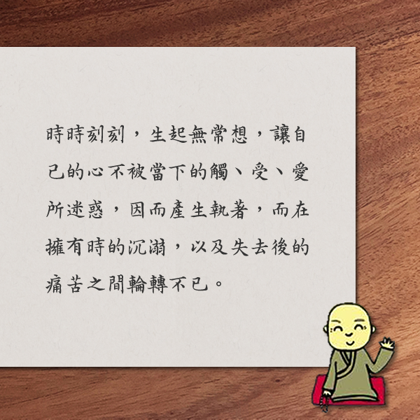 | ■ 文╱果然是大師 佛陀的忠實弟子波斯匿王侍母至孝,日夜請安問暖,將他高齡近百、日益衰弱的母親照顧得無微不至。有一天,就在波斯匿王出城時,他的母親卻壽終正寢!波斯匿王最倚重的大臣不奢蜜心想:「若是大王聽到這個惡耗,一定會過於悲傷難以承受,甚至可能因此病倒,我得想想,讓大王不致太過悲傷才是……」 不奢蜜於是命人備好五百頭白象、五百匹駿馬、五百名士兵、五百名歌女、五百名老婦、五百名婆羅門、五百名沙門,並準備五百件華服、五百件珍寶,更訂製上好的棺木,還以華麗的彩畫、絲綢、幡蓋裝飾,大隊人馬一路浩浩蕩蕩、載歌載舞,出舍衛城。 這時,波斯匿王正好回城,見狀問道:「這是怎麼回事?哪裡來這麼壯觀的隊伍?」不奢蜜上前回他:「報告大王,城裡有一位大富長者的母親往生了,這些都是為她準備的。」 波斯匿王不解問道:「準備這麼多老婦人做什麼?」不奢蜜回道:「這五百名老婦人是要獻給閻羅王,做為贖命用的。」波斯匿王聞言失笑:「這未免太愚癡了,就像有人落入鯨魚魚腹裡,怎麼可能還救得出來?」不奢蜜回覆:「沒關係,那就再加上五百名歌女贖命。」波斯匿王搖頭說道:「人死了絕不可能復生。」 「那就再加上五百件珍寶。」「那也不可能。」 「那就再加上五百件華服。」「不可能。」 「那就請五百個婆羅門同時施咒讓亡者復生。」「不可能。」 「那就再請五百個高僧說法,讓閻羅王放人。」「不可能。」 「那就集合五百個士兵,以武力救回亡者。」 波斯匿王忍不住哈哈大笑:「你愈說愈荒唐了!你聽過有人能長生不死嗎?」不奢蜜回答:「確實沒聽過。」波斯匿王於是說道:「是啊,確實沒有這樣的事,所以睿智的佛陀才會說,一切眾生皆歸於死。」 這時,不奢蜜突然跪下,對波斯匿王說道:「所以,大王,請您千萬節哀,就像您已經明白的,一切眾生皆歸於死。」 波斯匿王不解:「為什麼要我節哀?」大臣這才緩緩道出:「大王,太后今日往生了……」波斯匿王聽完,一時訝然無法回應,連嘆了數聲,待情緒緩和過來,體會了不奢蜜的用心後,才說道:「很好、很好,謝謝你用這樣的方式讓我知道……」說罷,便返回城裡為母親鄭重地處理後事。然而,後事一結束,他不待休息,便風塵僕僕地驅車趕去見佛陀。 他一見了佛陀,便說明母親往生的事實,接著涕淚俱下地表達內心的哀痛:「我願意用一切交換我母親的生命,用珍貴的白象、駿馬、車乘、金銀珍寶、奴婢、僕從,什麼都可以。甚至於,要我放棄我的國家、土地、人民,我都在所不惜,只要能換回母親的生命……」 佛陀開示道:「大王,如我曾說過的,您也已經知道的,一切眾生皆歸於死,人身似雪花、似灰壤,因此,當四大恐怖來時,沒有人能倖免,一是老,二是病,三是死,四是無常……」佛陀接著語重心長提醒:「就連您也一樣,不久,您也得面對這四大恐怖,所以,要常念無常、廣修無常啊。帶著無常的體會,依於正法治理國家,利益人民,這才是未來往生善處的保障……」一席話將波斯匿王從悲傷中敲醒。 「無常」,是大家耳熟能詳的概念,對於與自身不相關的生死、意外,人人都能以一句「無常」做為總結,以至於,「無常」好像成了風涼話。就像波斯匿王,他何嘗不知道無常、何嘗不知道生者皆歸死?然而,理智知道與切身經歷卻是天差地別,摯愛與習慣了存在的母親一旦往生,他還是痛徹心扉……而這可能是我們每一個人的寫照。 因此,佛陀提醒,無常,不只是一個概念或現象,而是一個修行的法門——時時刻刻,面對一切人、事、物,不管喜愛也罷,厭惡也罷,都要生起無常想,讓自己的心不被當下的觸、受、愛所迷惑,因而產生執著,而在擁有時的沉溺,以及失去後的痛苦之間輪轉不已,如此,心才能得到解脫。少一分煩惱、執著,就是多一分智慧,我們也更能做真正利人利己的事。 |