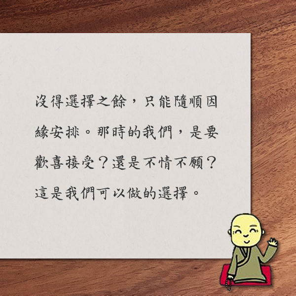沒得選擇之餘,以歡喜心包容接受,會發現路愈走愈寬 取得連結 Facebook X Pinterest 以電子郵件傳送 其他應用程式 7月 07, 2021 心靈電子報第917期 2021-7-7 心靈電子報/每週三發報 果然是大師 絕路走出活路人 每個人生階段、每個抉擇,我們都可以選擇煩惱,也可以選擇智慧。 ■ 文╱果然是大師 繼程法師在禪堂帶禪修時,抽空至法鼓文理學院,同學們得知後驚喜邀請法師到課堂上,為大家即席開示分享。該堂課授課老師楊蓓老師原本擔心法師過於疲累,不料繼程法師卻是歡喜接受,並分享這短短的幾分鐘內,自己所做的選擇。 法師說,當學生邀請他時,他可以選擇來,或者不來,但是如果選擇不來,大家可能會失望;當他選擇來了之後,他可以選擇抱怨自己的不情願,或是選擇做正面的分享,這兩種截然不同的態度,會為課堂帶來兩種截然不同的氣氛。於是,他選擇歡歡喜喜地來,歡歡喜喜地分享。 法師指出,人生就是這樣的一個過程,「我們經常必須做出抉擇,而抉擇就是判斷,有時候我們的選擇不是最好的,卻最符合當時的需要,及當時具備的條件。」就像禪修,每個人都希望能夠開悟,這是最好的選擇,我們卻達不到,只好選擇現有的條件能夠練習的方法,並且運用,依著現有條件,能做到哪裡,就做到哪裡。 「很多時候我們會發現,我們甚至沒有選擇。像是家庭、所處的環境,那是共業,我們是沒得選擇的。」譬如,災難。不過,即使沒得選擇,我們還是有選擇。「我們還是能選擇歡喜地接受它,而不是很苦惱地接受它,否則過程中會製造更多問題。如果歡喜包容接受,會發現路愈走愈寬。」相反的,如果覺得不得已而抗拒、逃避,也沒法真的逃避。 聖嚴師父說:「危機化為轉機時,絕路走出活路人。」有時候,生命給我們的選擇琳琅滿目,左右逢源卻也左右為難;有時候,我們彷彿走到了絕境,沒得選擇之餘,只能隨順因緣安排。那時的我們,是要歡喜接受?還是不情不願?這是我們可以做的選擇。 禪堂,又稱為「選佛場」,它提供我們一個道場,幫助我們從煩惱之中,選出智慧的心。然而,我們所處的任何環境,何嘗不是一個又一個的選佛場?每個人生階段、每個抉擇的時刻,我們都可以選擇煩惱,也可以選擇智慧。 七覺支中,「擇法覺支」的關鍵,即是做出智慧的選擇、找到智慧的方向,接著就是努力不懈,即「精進覺支」;既然方向正確,又努力不懈,那麼,我們自然會感受到歡喜、踏實、自在,即「喜覺支」,擇法與精進是因,喜則是果,有了因,結果自然湧現,不需強求。 也因此繼程法師說:「做了選擇,就歡喜地走下去,就算是被逼到牆角,還是用這種心歡喜接受,就會發現眼前的路一直開出來。」 聖嚴法師法語 只求好好的、實實在在的活在當下的這一秒鐘,不擔心下一秒鐘會怎麼樣,像這種活在當下的心理,才是最積極的態度。 ◎ 摘自:《找回自己》 本 週 選 讀 人生455期:創傷覺察與安心之道 人生雜誌編輯部 覺察是面對這場內在戰役的關鍵一步,接受生命的困頓,從而提起方法,為心靈清創,重建生命的希望...... 無門關:開悟的臨門一腳 無門慧開禪師 如果執著一切皆無、一切皆空,又落於偏。凡夫眾生執著有邊,或是修行者執著無邊、執著空邊,都是偏見...... 智慧掌中書 在一般人的想像中,有錢人家的孩子,一定是非常滿足的。 然而,當中還是有不滿足的,甚至比窮人家的孩子更不滿足。 我就遇到過一位家境富裕的人,從小就受到很好的家庭及學校教育。可是對一般人的生活,他完全沒有經歷過,因此他反而羨慕一般人。 他對我說:「我不知道我究竟是幸福、不幸福。我的父母對我實在太好,也因此許多事情我都不會做,也不懂。我沒有辦法過一般人的生活,有時我覺得這是生命中的無奈,我無法如一般人自由自在。」 由此可見,人在世上,對自己生命現象的處境,很少能感到完美滿足的,我們應該學習知足,並瞭解人的出生是因自己往昔的因緣所造成,而不是受制於人,也沒有被誰作弄。 能不能改善自己、提昇生命,才是重要的課題。 摘自:《知足最滿足》 延伸閱讀: 真正的快樂(大字版) 聖嚴法師 聖嚴法師綜觀各種讓人不快樂的原因:生老病苦、怨仇憎惡苦、求不得苦、身心煩惱苦,帶領我們超越煩惱的層層幻網,不但告訴我們什麼是讓人「受苦」的原因?更引領我們發現什麼是「真正的快樂」? 活 動 頭 條 注入心靈活水 聖嚴思想國際學術研討會首度線上舉行 法鼓山方丈和尚果暉法師透過預錄畫面,向主辦單位及參與的學者來賓表達感謝,方丈和尚並以法鼓山創辦人 聖嚴法師「學術研究重在能自利、利他」與大眾共勉,期望能透過眾人持續研究,發揮佛法利益眾生的好處,接引社會大眾親近佛法...... 帳篷筆電來助力 法鼓山運轉全民防疫愛心 嘉義縣長翁章梁表示,當此疫情嚴峻時刻,疫苗陸續到位,縣內設置多處大型疫苗接種站;感謝法鼓山慷慨捐贈帳篷,共同相挺,一同攜手挺過這艱難的疫情...... 《佛法綱要》新版上市! 掌握佛法綱要,修行道路將如佛陀親自帶路般清楚無礙...... 查看活動 法鼓文化 版權所有 © 2021 Dharma Drum Corp. All Rights Reserved 電子報管理:點此訂閱 / 取消電子報 取得連結 Facebook X Pinterest 以電子郵件傳送 其他應用程式 留言