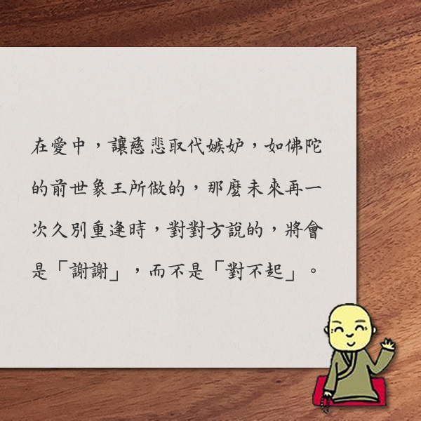 每個相遇都是久別重逢。在愛中,讓慈悲取代嫉妒 取得連結 Facebook X Pinterest 以電子郵件傳送 其他應用程式 8月 18, 2021 心靈電子報第923期 2021-8-18 心靈電子報/每週三發報 果然是大師 久別重逢 會讓一個人愛的、恨的,無他,只因為彼此在無數個前世已經種下了極深的因緣,從佛法的角度來看是同修,因為對對方有功課要做。 ■ 文╱果然是大師 七夕剛過。關於愛與嫉妒,佛陀曾說過這麼一個故事: 很久以前,雪山上有一隻罕見的六牙白象。這隻白象宿世修行佛法,現世則以其威德統領群象,並有兩個夫人。一次,象王與兩位夫人出遊時,途中經過一棵大樹,象王見到樹上繁花盛開,為了讓兩個夫人開心,於是搖動樹枝,一時落英繽紛,只是,因為風向的關係,花朵全落在大夫人身上,而在上風處的二夫人卻一朵花也沒得到,她以為象王偏心,心裡又氣又委屈。又有一次,象王得到一朵金色的千葉蓮花,順勢給了一旁的大夫人,晚到的二夫人見狀,強烈的嫉妒使她由愛生恨,而對象王起了殺心。 此後的日子,不論象王如何待她,她總會與大夫人比較,並一再加深她的恨意。在極度的嫉恨之中,她決定輕生,由於她平時便會採花?供養多位在雪山上修行的聖人,於是,她在臨終前發下毒願——願以供養功德,來世生於豪貴人家,並能憶起此世遭遇,誓殺象王復仇。 果然,二夫人往生後下生人間,憑藉出色的聰慧與美貌而成為王后,得到國王極度的寵愛,她知道自己復仇的時刻到了,因此,她故意裝病,假托夢見一頭六牙白象,告訴國王,只要能得到那頭白象的象牙,她的病便可以痊癒。國王於是派遣獵人,依照王后所敘述的地點,設下埋伏,終於成功以毒箭射殺象王…… 象王由於宿世的修行力,得知這一切都是二夫人所為,因此臨死之前自斷象牙,要獵人帶回去贈與王后,並且,為免象群發怒追殺獵人,還以神力保護他安全離開雪山,這才氣絕身亡…… 獵人帶著象牙回到王宮覆命,王后見計劃成功先是開心不已,然而,隨著獵人的敘述,王后細細端詳象牙,前世今生種種閃過眼前。她籌劃了多年,為的就是這一刻,她沒料到,此刻湧上心頭的卻是滿滿的悲傷與悔恨……於是,她當下在心裡誓言,祝願象王未來能修成無上菩提,並願自己將來能夠以修行斷除貪瞋癡帶來的無明痛苦。 佛陀說完這個故事時,大眾中突然有位已證得阿羅漢果的大比丘尼笑了起來,笑後卻突然失聲痛哭,並且對佛陀說:「請接受我的懺悔……」佛陀慈藹地說:「我當時就原諒妳了。」原來,六牙白象就是佛陀的前世,同樣在座聽法的耶輸陀羅則是象王的大夫人,而這位大比丘尼就是二夫人。她為了自己已從愛恨情仇中解脫而慶幸欣喜,也為了自己曾經為了愛與嫉妒,做過如此傷天害理的事而慚顏哽慟。 從佛法來看,確實,每個相遇都是久別重逢。會讓一個人愛的、恨的、嫉妒的、痛苦的,無他,只因為彼此在無數個前世已經種下了極深的因緣,從佛法的角度來看是同修,因為對對方有功課要做;從世間的角度來看是患難之交,因為每個人都在面對生、老、病、死、怨憎會、愛別離、求不得、五蘊熾盛的苦,沒有人能自絕於外,也沒有人能完全不藉助他人的力量,獨自度過這些苦。 因此,不論是久別重逢,是同修,還是患難之交,不都值得我們多一點的退讓、寬容與成全嗎?在愛中,讓慈悲取代嫉妒,如佛陀的前世象王所做的,那麼未來再一次久別重逢時,對對方說的,將會是「謝謝」,而不是「對不起」。 聖嚴法師法語 唯有當你放下自我中心的身心世界, 再來看這世界時, 才會處處自由自在。 ◎ 摘自:《禪鑰》 本 週 選 讀 日韓佛教史略(四版) 聖嚴法師 聖嚴法師認為,在了解佛法和研究戒律時,不能忽略佛教歷史的演變,於是深深感覺到確實有必要編寫一部能為現代人所接受的佛教通史...... 我快樂 因為我知「道」 妙益法師 行到困難處,有變通換道的睿智,有轉念思考的智慧,不見「該有」的苦惱憂悲,帶領我們走向任何問題的另一種思考答案...... 素食聰明吃 禪味小食堂──黑胡椒毛豆 毛豆是未成熟的黃豆,此時是綠色的豆筴,做成的黑胡椒毛豆是很熱門的小菜。烹煮毛豆,通常連豆莢一起煮,因為毛豆很鮮嫩,許多人會連豆莢一起吃下肚。 做法 : (1) 毛豆先以1╱2大匙鹽搓後,沖水洗淨,瀝乾,每顆毛豆莢兩端修剪去除,幫助入味。 (2) 辣椒洗淨,輪切備用。 (3) 滾水一鍋放入1大匙鹽,加入毛豆、八角,煮開即轉小火,約7分鐘後撈出,攤開放涼(以防變黃),再加入所有調味料拌勻,放入冰箱冷藏更入味。 TIPS: 毛豆莢撈出前,可試試軟硬度,若喜歡軟一點,可以多煮幾分鐘。 摘自:《人生雜誌395期》 延伸閱讀: 四季禪食 林孝雲 從選擇食材到調配、烹飪和飲食,都能夠順應大自然規律,那就是掌握了生活烹飪藝術。料理如果能夠讓心與身體、大自然環境協調的話,那就有了禪的身心不二精神,身在哪裡,心就在哪裡,身心合一...... 活 動 頭 條 欣賞生命這朵花 簡單捨得也是美 8月8日上午10點,法鼓山舉辦「居家線上分享會」第四場活動,與談人之一的法鼓山青年院監院演柱法師,從佛法關照生命的立場,指出學習用欣賞的角度看待事物,會發現自己的生命也因此富足...... 心靈環保心疫苗 7項行動啟動一週心淨化 法鼓山於中元節前,推出「心靈環保心疫苗」,用行動淨化身口意,邀請網友們在臉書(https://www.facebook.com/ddmorg/)響應「一日三時,一週繫念,一起心淨化」,利益自己和社會,也為8/22