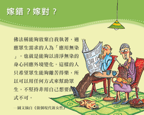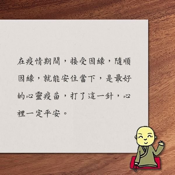 接受因緣,隨順因緣,就能安住當下 取得連結 Facebook X Pinterest 以電子郵件傳送 其他應用程式 9月 01, 2021 心靈電子報第925期 2021-9-1 心靈電子報/每週三發報 果然是大師 先打心靈疫苗保平安 懂因果,凡事不會怨尤;明因緣,凡事不會強求。 ■ 文╱果然是大師 現在親友碰面、社群問候語,常常是:「您打疫苗了嗎?打哪一款?有副作用嗎?」若有副作用,就被稱為「被疫苗認證的年輕人」;沒副作用的,則被譏為「沒有抗體的老人」……。各式話題,圍繞疫苗,至於不打疫苗者,則不太出聲,因為,可能會被冠上「有損疫苗覆蓋率的人」。 但是在五、六月間,由於疫苗量不足,許多宗教團體喊出了「心靈疫苗」一詞。強調在沒有醫藥上的疫苗保護身體時,我們應該先保護自己的心,讓心更具有免疫力。 佛法的心靈疫苗是甚麼?印象很深刻的是,在我剛出家時,聖嚴師父有次早齋,開示我們弟子們,不須想去念佛學院,才懂得修行,真正懂修行的人,只要掌握六個觀念,實際運用在生活中,就可以過得自由、自在、平安、健康、快樂。師父說:因緣、因果、苦、空、無常、無我。 佛法不離因緣、因果觀。疫苗何時到,是甚麼牌子的?背後影響的因緣非常多,有時真是只能用「重重無盡的因緣」,所以,隨順因緣而走,是最自在的。選擇是辛苦的,等待往往落空,落空後,往往伴隨抱怨、憤怒等情緒,那真是心靈的毒素、病毒,任何廠牌的疫苗都擋不住的。 「懂因果,凡事不會怨尤;明因緣,凡事不會強求。」聖嚴師父的自在語,在疫情期間,接受因緣,隨順因緣,就能安住當下,是最好的心靈疫苗,打了這一針,心裡一定平安。 聖嚴法師法語 從苦難中走出來的人, 即使正在受苦,也不會覺得那麼痛苦, 因為對他來說,已沒有苦難這回事。 能不以苦難為苦難, 這就是真正的滅苦。 因此,消極的出世 並不能帶來真實的快樂, 只有積極的知苦、體會苦, 從苦難中成長, 才可以真正的離苦得樂。 ◎ 摘自:《快樂自己決定》 本 週 選 讀 大智慧到彼岸:心經講記 釋寬謙 從《心經》得到的轉變和法喜,希望大家都能拾起《心經》,放下心事,以經文來觀照現實人生的般若智慧,一定能轉煩惱為菩提,心開意解...... 開始學習禪修 凱薩琳.麥唐諾 儘管這些年來科技上的長足進步,佛陀所指導用以釋放內在潛能、獲致真實長久之身心健康的方法,卻仍頗具力量,依然合用...... 智慧掌中書 有個女兒問媽媽說:「妳和爸爸結婚前談了幾年的戀愛?」 媽媽說:「那個年代談什麼戀愛,我爸媽叫我嫁,我就嫁。」 女兒又問:「我和丈夫愛情長跑多年,可是結婚後總覺得嫁錯了人。媽媽妳也有這種感覺嗎?」 媽媽說:「我沒有想過嫁錯、嫁對,只覺得嫁雞隨雞。」 女兒馬上說:「媽媽,妳真能夠適應環境。」 佛法稱能夠放棄自我執著,以適應所有一切眾生需求的人,為「應用無染」。也就是說,能夠以清淨無染的身心,回應外境變化。這樣的人只希望眾生能夠離苦得樂,所以可以用任何方式來幫助眾生,不堅持非用自己想要的形式不可。 這個媽媽就是「應用無染」的人,不管丈夫好壞,只要把自己做太太的本份做好,不執著自己一定要做什麼樣的太太,也不執著丈夫一定要成為什麼樣的丈夫,這種態度真是了不起! 摘自:《做個現代新女性》 延伸閱讀: 做個現代新女性 聖嚴法師 破解女性對於於修行的種種迷思,例如女人業障重、女人不能成佛……等等,讓您做個快樂自信的現代新女性! 活 動 頭 條 擴大共修同心圓 安和分院本週推持誦《地藏經》 8月23日午後,法鼓山安和分院啟動為期一週的地藏經修持,至28日前,每日中午12:20-14:00網路連線直播,禮請常嘉法師擔任主法、僧俗代表領眾共修...... 紫雲寺中元報恩無遠弗屆 家宅永安利冥陽 適逢農曆7月孝道月,在慎終追遠的時節,佛教特別重視知恩報恩的精神,法鼓山紫雲寺於8/23~8/29期間舉辦中元報恩法會,恭誦《地藏經》、禮拜《地藏懺》,祈求疫情共業早日平息、全球重現往日生機...... 《人生》雜誌457期9月號出刊 無須言語,您自然會感受到一股沉澱心靈的攝受力…… 查看活動 法鼓文化 版權所有 © 2021 Dharma Drum Corp. All Rights Reserved 電子報管理:點此訂閱 / 取消電子報 取得連結 Facebook X Pinterest 以電子郵件傳送 其他應用程式 留言