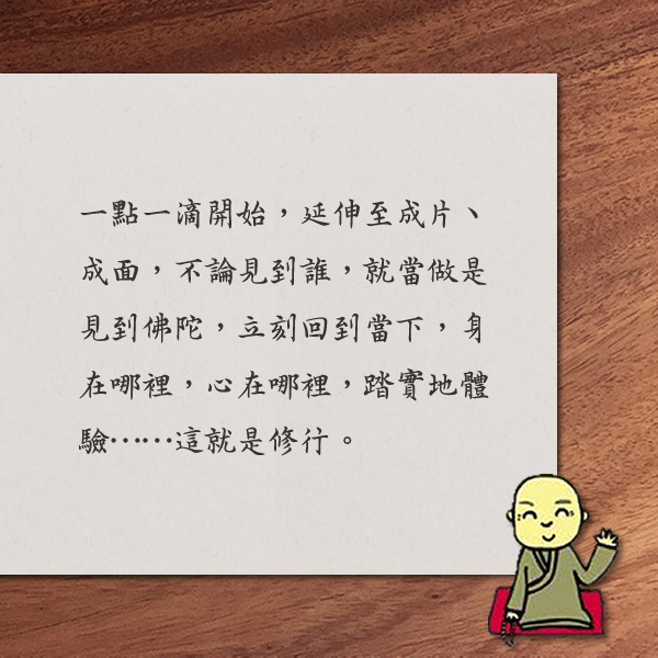 時時提醒自己回到當下,踏實地體驗生命……就是修行 取得連結 Facebook X Pinterest 以電子郵件傳送 其他應用程式 12月 08, 2021 心靈電子報第939期 2021-12-8 心靈電子報/每週三發報 果然是大師 這是水,這是佛法 禪,是視之無色、聽之無聲、嗅之無味、捉摸之無感觸、嚐之亦無滋味的存在,但也未嘗離開我們日常所處的世界。 ■ 文╱果然是大師 兩隻魚在水裡游著,一隻老魚迎面游了過來,親切地問候道:「早安啊,孩子們,今天的水怎麼樣?」說著,便自顧自游開了。這兩隻魚繼續往前游了會兒,其中一隻終於忍不住開口問道:「『水』到底是什麼鬼東西?」 這是美國作家華萊士(David Foster Wallace),在二○○五年的一場畢業致詞中所說的小故事。他以故事中的「水」,指涉對於我們的生命至關重要、無所不在,偏偏平淡無奇到我們經常未能加以留意的部分。 《雜阿含一○八○經》中記載,當時,佛陀住在鹿野苑中,晨起,便著衣持缽到波羅奈城中托缽乞食。進到城裡,佛陀看見另一位同樣也在城中乞食的比丘,那位比丘原本心不在焉、東張西望、行儀散漫,遠遠見到佛陀走來,立刻面露愧色,收攝六根、端身正視而行。 回到精舍,用過齋後,佛陀便問道弟子們:「今天早上我在城裡遇到的那位比丘,是哪位?」眾人面面相覷,其中一位比丘慚愧地起身坦承:「世尊,是我,我原本心不在焉、行儀散漫,是遠遠看到世尊您走來,才想起要收攝身心、護持威儀。」 大家原以為佛陀會給予這位比丘提點或責罰,不料,佛陀卻是點頭讚賞:「很好、很好,您見了我知道要收攝身心六根,這就是修行。」佛陀轉而對眾弟子宣告:「大家都應該要向這位比丘看齊,並且,學習不只見了我,而是見到其他比丘、比丘尼、優婆塞(在家居士)、優婆夷(女居士)時,也要如此收攝身心六根。若能如此修行,自然能夠漸漸深入法義,體會到與佛法相應相契的法樂。」 「四念住」為佛教的根本修行方法,在觀身、觀受、觀心、觀法中,明瞭佛法所說的緣起、無常法則,以及苦集滅道四個聖諦,在我們的生命中無所不在。然而,我們就像經中的比丘一樣,即便處於當下的身心、環境,卻滿頭滿腦都被我們覺得更重要、更有趣的事情給佔據,因而心不在焉,對外境,甚至對自己的身心不知不覺。長此以往,別說對佛法能有什麼體認,就連對環境的觀察認知,乃至對自己的認識,都不夠細微深入——就像故事中那兩隻魚。 因此,聖嚴師父說:「禪,是視之無色、聽之無聲、嗅之無味、捉摸之無感觸、嚐之亦無滋味的存在,但也未嘗離開我們日常所處的世界。所以它是到處都有、時時都有、人人本有的。但是唯有通過了修行的方法始能體驗到禪,它本來就是我們自己,卻是從未見過面的自己……那是純淨的智慧,也是超絕的自在。」這樣的智慧,需要日積月累的體會才能證知,下手處,即是聖嚴師父所說的:「踏實地體驗生命,就是禪修。」 從一點一滴開始,延伸至成片、成面,不論見到誰,就當做是見到佛陀,立刻回到當下,身在哪裡,心在哪裡,踏實地體驗……這就是修行。 聖嚴法師法語 一般人對於喜愛的,貪得無厭,得到之後,又怕失去;對於不喜愛的,拚命躲避,卻又揮之不去,因此惹出種種的煩惱。這好比把自己放在熱鍋上,釜底添柴加油,看似一個無辜者在火焰中被煎熬,其實是自作自受。 ◎ 摘自:《智慧100》 本 週 選 讀 動物大車拼 陳辰 一場比賽,碰到許多意想不到的狀況:塞車、違規、大迷路……,這些都是很正常的「無常」。故事的玄妙在於,參賽成員將比賽的結果看淡了...... 半朵花:生命探索故事101 覺年法師 這世界是黑、白各一半,並非完美的,我們不能只看缺點,要懂得欣賞生命缺陷中的美,懂得欣賞一半一半的世界,才有快樂的人生...... 素食聰明吃 禪味小食堂──辣高麗菜卷 一提到韓式小菜,令人馬上聯想到辣椒,辣高麗菜卷是常見的韓式小菜,利用辣椒粉或辣椒醬調味,口口都是鮮紅辣椒特有的甘甜。 做法 : (1)先將辣醬等所有材料放入鍋中,開小火煮滾,放涼,放入玻璃罐中,備用。 (2)高麗菜葉洗淨,放入滾水汆燙,變軟即可撈出,放入冷開水中漂涼,瀝乾備用。 (3)取二張高麗菜葉重疊,由內往外,緊實地捲起來,切成3∼4公分的長度。另二張重複做法。 (4)取1╱2大匙辣醬,拌入冷開水調勻成醬汁。 (5)切好的高麗菜卷,排入盤中,淋上適量的辣醬汁,即可食用。 摘自:《人生雜誌397期》 延伸閱讀: 今天吃素便當:異國風、重口味、古早味、低卡養生等150道美味料理自由配 齋心主廚 疫情期間帶便當最好、最安全!古早味、低卡養生、日韓、南洋、歐風素料理任君選,今天開始吃素便當...... 活 動 頭 條 超度生死的煩惱 法鼓山全球連線三時繫念 法鼓山方丈和尚果暉法師於11月27日,透過大悲心祈福法會線上直播,開示大眾以「三時繫念」作為佛事圓滿,就是祈盼眾生都能藉由信仰、修持,超度生死的煩惱,從苦難中得安樂、從危險中得安全、從束縛中得到解脫...... 別再逃了 勇敢報名探索你的壞與why 法鼓山世界青年會將於2022年1/21(五)~1/23(日),連續舉辦3場「壞why派對」,邀請18~40歲的學生、職場工作者,藉由心靈探索、剖析書寫、故事分享、情境引導等等方式,一同找到對治習性的解方...... ◆2022年【福田班】招生中 邀您一起開發心中的寶藏...... 查看活動 法鼓文化 版權所有 © 2021 Dharma Drum Corp. All Rights Reserved 電子報管理:點此訂閱 / 取消電子報 取得連