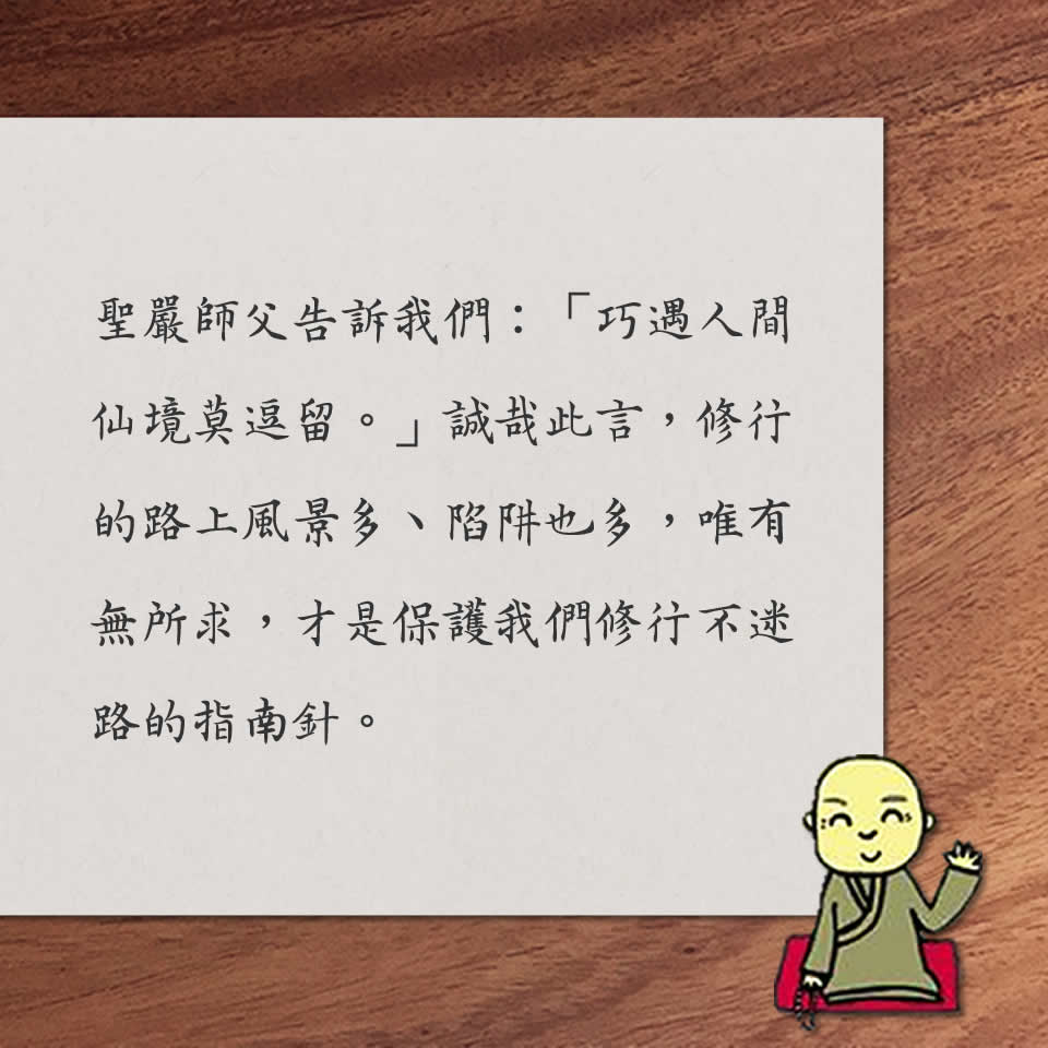 | ■ 文╱果然是大師 曾經,罽賓國(古代西域國家)有位得道高僧,教出的弟子之中,有得四禪的、有得神通的、有證初果二果乃至四果的,個個修行成就極高,因此許多人慕名而至,門下經常有數百門徒。 一日,這位高僧感慨門徒修行心念不正,只求神通不求解脫……突然,他想起多年前有位來自安息國的弟子,那位弟子慧根深厚,很快就學會了五種神通,並且經常展現他的神足通,飛天、遁地、分身、隱身……樣樣都易如反掌。當時,他屢屢勸道弟子:「你雖擁有神通之力,但是你未斷煩惱,未證聖果,此時展現神通只會徒增慢心,障礙修行。」幾次下來,那位弟子聽厭了,反而覺得師父在打壓他,一氣之下,負氣離開師門…… 這時,高僧想知道這位弟子的現況,於是以天眼通尋找,一看之下,訝然發現他在安息國的城裡行乞,於是,他召集門人,宣布道:「你們快做準備,我要帶你們去見幾年前一位來自安息國的師兄,他的神通非常高強。」弟子們一聽興奮極了,以為那位師兄現在的成就一定非凡…… 罽賓高僧於是以神足帶領所有弟子來到當年的安息比丘面前,眾人意外眼前竟是一位盲眼的落魄乞丐。罽賓高僧呼出安息比丘的名字,乞丐聞聲一驚:「你是……?」罽賓高僧回答:「我是你的師父!」乞丐趕緊雙跪地,卻慚愧地抬不起頭來。在師父的詢問下,他悔不當初地說出這幾年的種種遭遇…… 原來,當年他一回到安息國,便進宮向國王大顯神通,國王因此對他崇敬不已,邀他住進宮中,於是,他得了前所未有的名聞利養,日子過得滋潤極了。 不久,他調戲宮女的醜聞傳出,臣子們聽說後,向國王上奏,國王反而訶責群臣不敬三寶……後來,一名宮女的肚子一天天大了起來,國王、王后查明真相後,這才證實他果然修行不清淨,憤而奪去他的僧服,將他趕出宮中。 他失去了比丘身分,更因縱情聲色及名聞利養,定力退失,神通自然也跟著退失了,沒有一技之長的他流落街頭,仗著自己身強力壯,竟開始打家劫舍……被捕後,他被認出是之前王宮內的比丘,而被送至國王面前。國王再見到他後,對他的行逕既同情又不恥,說道:「你修行不清淨我可以當做是偶然的過失,沒想到你竟然自甘墮落去做劫匪……好,我就再饒你一次,但若是你再犯罪,我就把你流放境外!」 從此,他開始打雜為生,甚至受屠夫僱用,幫忙殺牛殺羊,豈料,某日,他在工作時竟被碎骨片刺中眼睛,雙眼失明的他慘遭解僱,迫不得已,只好淪落至城中行乞,也就是高僧一行人見到的模樣。 眾人聽聞他的遭遇唏噓不已……高僧也語重心長地勸道弟子們:「就算得了五種神通,也不離因緣無常之法,不足以憑恃啊!」當場,許多利根的弟子一聽,當下便證得了阿羅漢果。 這則故事出自《雜譬喻經》。我們常聽說「神通抵不過業力」,佛陀的弟子中,神通第一的目犍連在母親往生後以神通觀看,發現母親墮落在餓鬼道,卻無法運用神通幫助母親脫離苦痛,甚至,他自己也被外道亂杖打死,無法以神通改變定業。 因此,聖嚴師父說:「佛教主張因緣果報,一切的一切,皆緣於過去生中的業力牽引,而有現前的受報;未來的出路,也要靠著各自本身的努力才會慢慢好轉,單憑神通是無濟於事的。」 特殊感應與神通,猶如成佛之道上的風景,雖然迷人,但終究不是我們的最終目的,被風景吸引而耽擱行程,擔誤的,是我們自己的修行與生命,更可能求升反墮,永遠到不了目的地,所以,聖嚴師父告訴我們:「巧遇人間仙境莫逗留。」誠哉此言,修行的路上風景多、陷阱也多,唯有無所求,才是保護我們修行不迷路的指南針。 |
