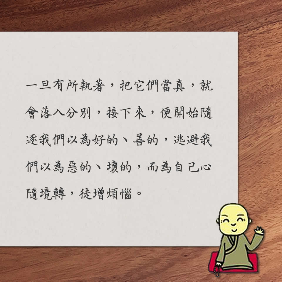 | ■ 文╱果然是大師 有一次,波斯匿王靜坐思惟,有所感悟:「這世界上,能夠擁有名利富貴的人太少了,而擁有名利富貴的人之中,能夠知足而不放縱、節儉而不驕奢、謙虛而不盛氣凌人,這樣的人更是少之又少。相反的,擁有一點小財富就憍慢放逸、縱情聲色、仗勢欺人的人,佔了大多數啊!」 波斯匿王這麼想著,於是前去拜見佛陀,向佛陀報告他靜中思惟所得,佛陀聽了,認同地感慨道:「確實如此,大王,您的觀察是正確的,世人就是如此可憐,好不容易享有名利富貴,卻因而變得貪婪多欲、放縱沉淪,這樣的人,福報享盡後,只剩無盡的苦報等著他,甚至可能為自己種下地獄果報……」 佛陀接著以漁網為喻:「就像善於捕魚的人,將細密的漁網深入水中拖行,不論魚鼈黿鼉,都被一網打盡,無能倖免,生死禍福都掌握在漁夫手中,怎麼逃得過呢?財、色、名、食、睡等五欲,就像漁網一樣,凡夫輕易地就被網入其中,因而造業受報、流轉生死,求出不得啊!」 這個故事記載在《別譯雜阿含經》卷三中。翻開歷史、翻開報章,太多前仆後繼的真人實例,映證了波斯匿王的感悟。然而,名利富貴明明是福報,是培福消業、廣結人緣所得,為什麼擁有它們,卻常常讓人樂極生悲? 《佛說淨業障經》提供我們一個解答。經中,佛陀對文殊師利菩薩說:「貪欲是障礙,瞋恚是障礙,愚癡是障礙,布施是障礙,持戒是障礙,忍辱是障礙,精進是障礙,禪定是障礙,智慧是障礙……」 文殊菩薩不解,反問:「貪、瞋、癡是障礙法,這我們都能理解?為什麼連布施、持戒、忍辱、精進、禪定、智慧……都是障礙?」 佛陀解釋:「其實,沒有任何一法、沒有任何東西,能形成障礙,真正造成障礙的,是凡夫無智慧的心。以布施來說,凡夫無智的人行布施時,對被布施的人不能生起恭敬心、對布施得比自己少的人,也不能生起恭敬心,甚至因為不恭敬,而生起嫌惡、比較、瞋恨的心;又如持戒,戒行圓滿的人,見到他人犯戒,心裡無法對對方生起恭敬心,反而輕視不屑;能行忍辱而輕視他人不能忍辱;自能精進而輕視他人不能精進;禪修工夫好就輕視他人心浮氣躁……心裡輕視,更可能進而口說他人之過,這樣的人,便可能因為瞋心、慢心,而為自己種下生於惡趣的種子。」 因此,佛陀指出:「取要言之,若於諸法有縛有解,當知如是皆是障礙。」不管是名利、五欲、善法……總之,一旦有所執著,把它們當真,就會落入分別,接下來,便開始隨逐我們以為好的、善的,逃避我們以為惡的、壞的,而為自己心隨境轉,徒增煩惱。 所以,就佛法而言,遇到好的境界、好的果報,只需如常以對,不需要得意忘形;壞的境遇、壞的果報來了,同樣如常以對,更不需要失意忘形。如聖嚴法師所說:「人生的苦與樂,往往來自心的體驗。若能把人生的苦樂,當成是增長慈悲心和智慧心的過程,就是大自在人。」 不論好壞苦樂,都是讓我們歷事鍊心、借假修真的所緣,若能學習以空性的智慧去觀照,不把福報當真而放縱揮霍,也不把惡報當成障礙而消極喪志,也就不會上當,讓自己平白受苦了。 |